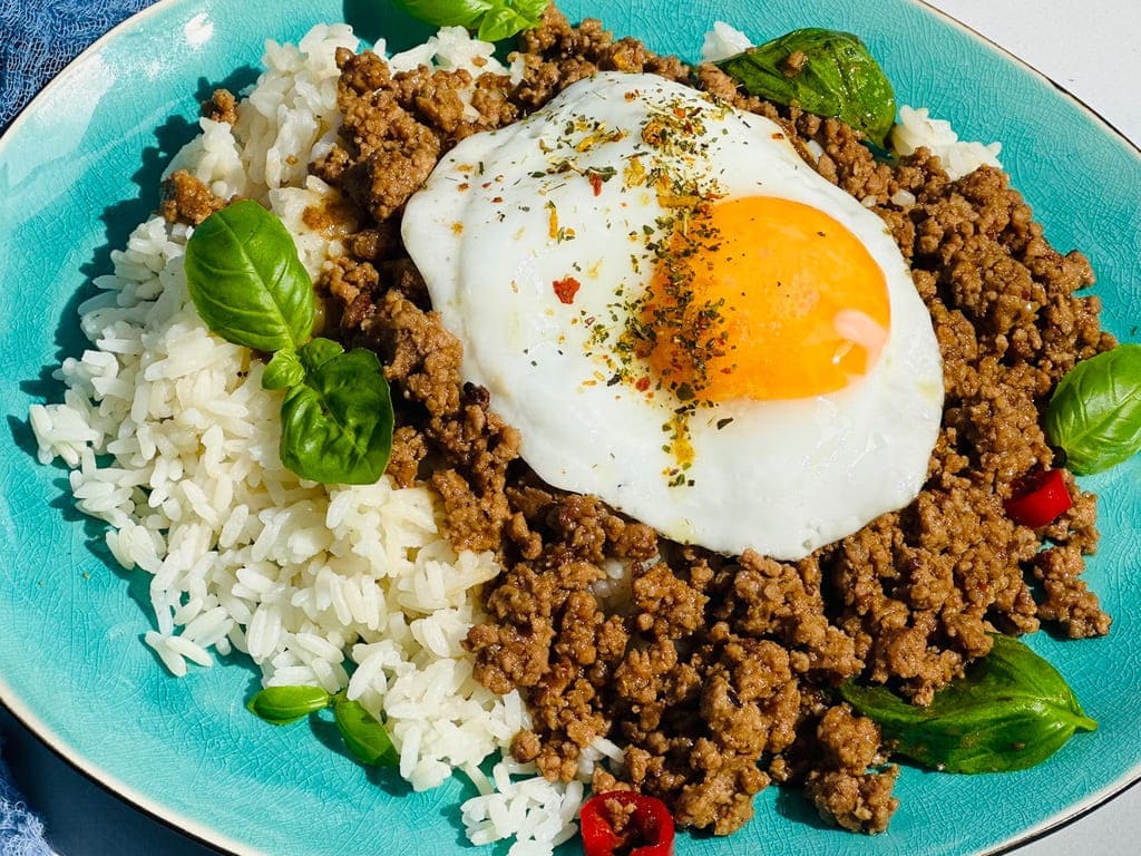 Reis zusammen mit dem Hackfleisch und dem Spiegelei anrichten und servieren.