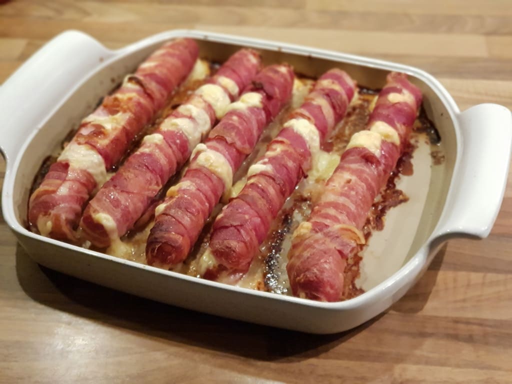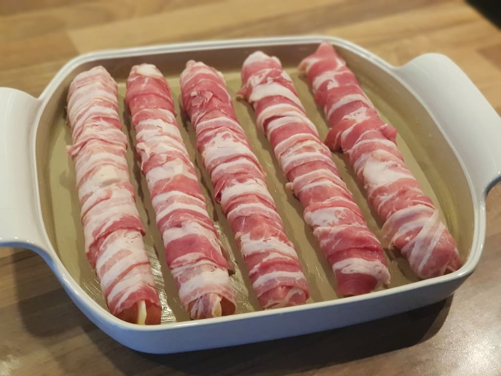 Nach dem alle Würstchen eingewickelt sind im vorgeheizten Backofen bei 210 Grad Ober- / Unterhitze für ca. 20 – 25 Min backen lassen.