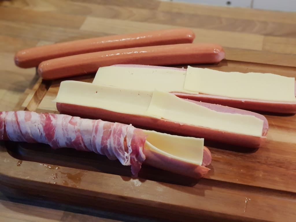 Den Käse hineinlegen, Wurst zusammen klappen und mit dem Bacon einwickeln und in den flachen Bäker legen.