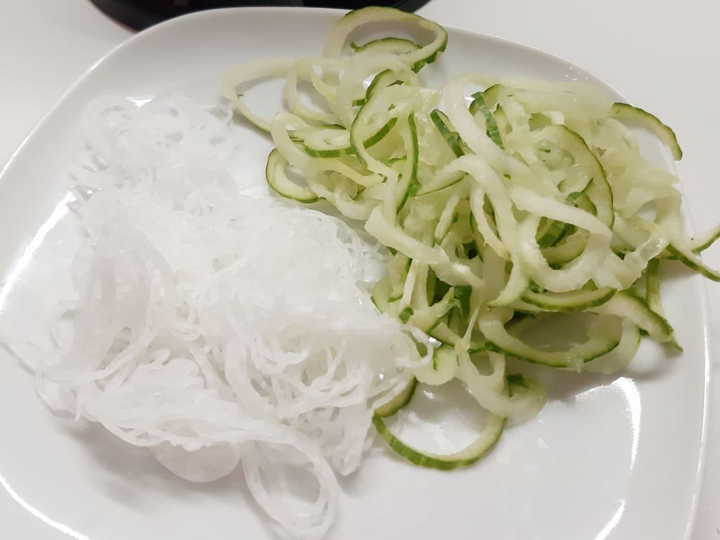 Die Gurken mit dem Gemüseschneider in Linguine schneiden und darauf achten, das die Streifen nicht zu lang werden.