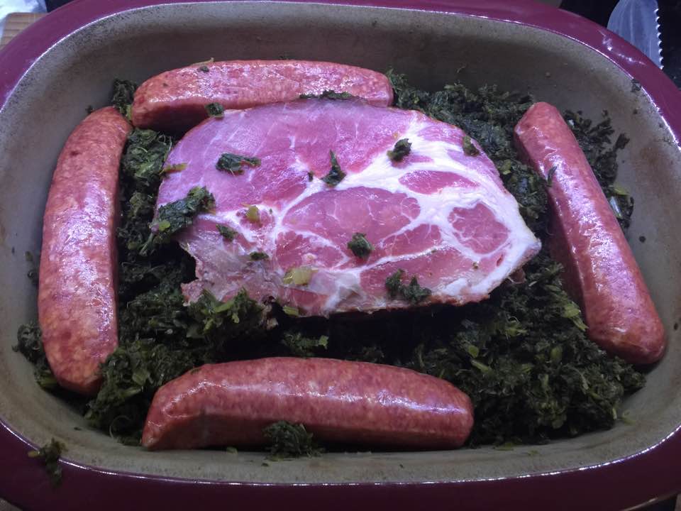 Den Grünkohl mit den Graupen im Ofenmeister vermengen.