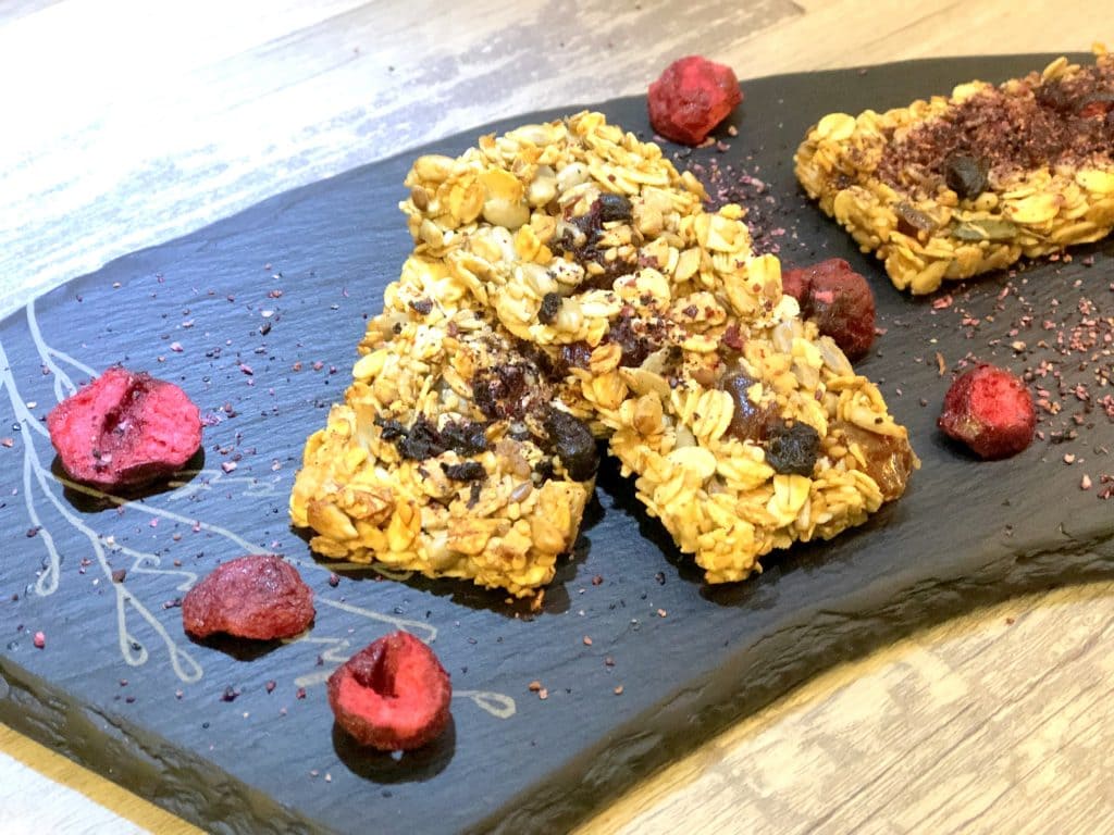 Einige Müsliriegel bestreue ich mit dem Heidelbeeren Pulver. Das ist wirklich unglaublich lecker und sehr intensiv.