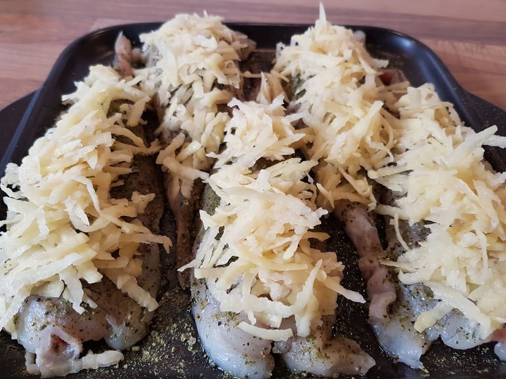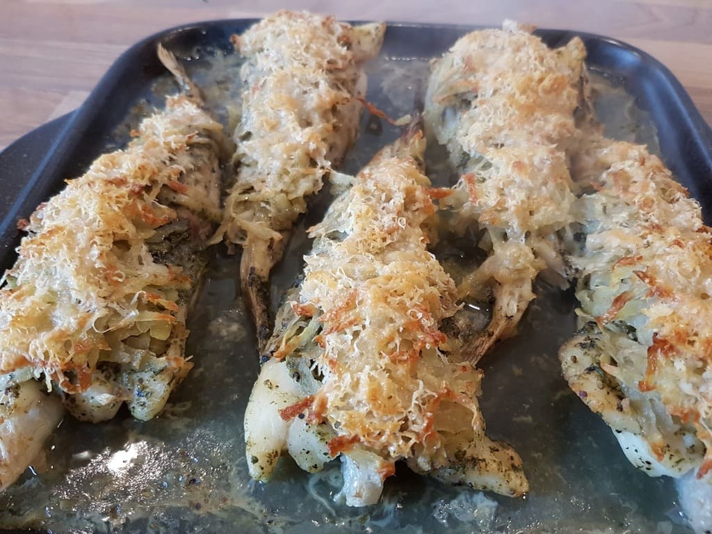 Backofen auf 180 Grad reduzieren und den Fisch auf der untersten Schiene für 30 Min Ober- / Unterhitze backen.