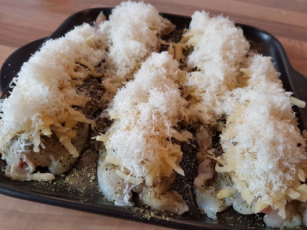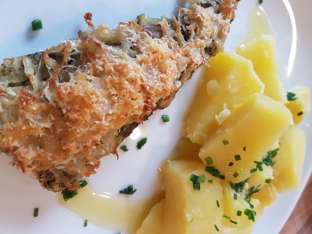 Anschließend auf den Fisch legen, den Parmesan mit der Microplane® Reibe fein reiben und auf den Kartoffel verteilen.