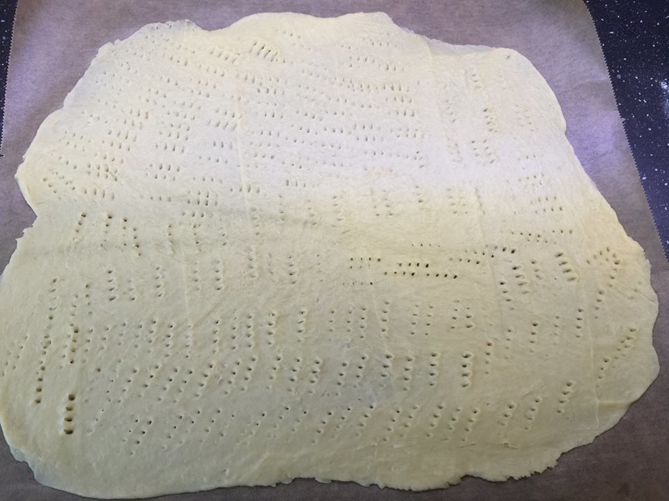 Bitte darauf achten das der Teig etwas kleiner ausgerollt wird als das Backblech ist.
