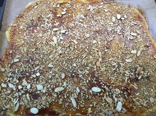 Jetzt kann man den Teig schonmal auf das Backblech ziehen.